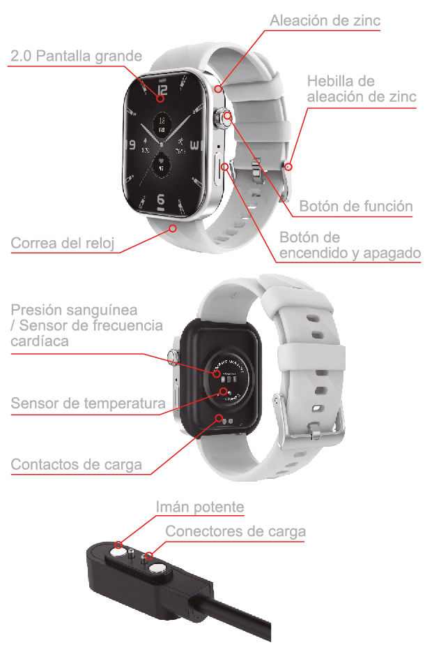 – Conectar la interfaz de carga en la parte de abajo del reloj, cargar durante 5 minutos, o