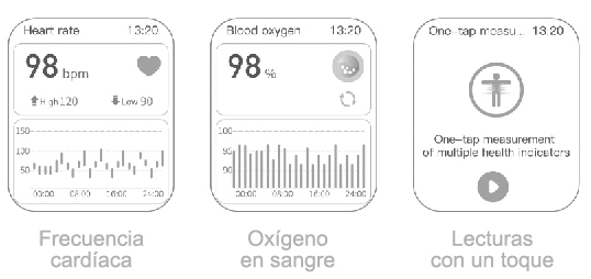 Las lecturas con un toque pueden medir la frecuencia cardíaca, el nivel de oxígeno en sangre y la presión sanguínea a la vez. Para realizar la lectura, dejar las manos estiradas sobre el pecho y no hacer movimientos.