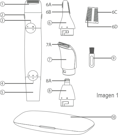 Este cabezal es adecuado para recortar la nariz y pelo de orejas. Instale el cabezal de corte para nariz y orejas. Inserte suave y lentamente la punta del cabezal de corte en la entrada de la nariz y oídos (no lo introduzca demasiado profundo para evitar lesiones). Limpia el fosa nasal y canal auditivo después de recortar.